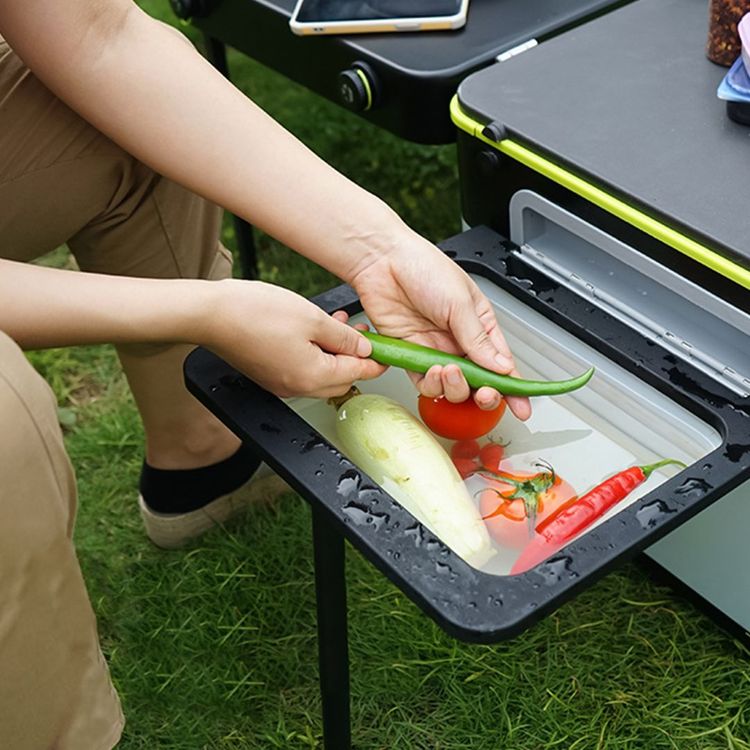 المطبخ المتنقل الطاولة ارجل الطاولة شعلة الغاز لوح التقطيع وعاء غسل الخضراوات وغيرها
