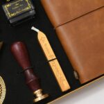 رأس القلم والريشة والستاند مصنوع من المعدن المقاوم للصدأ مقبض الختم من خشب الورد العتيق زجاجات الحبر من الزجاج والعبوات الصغيره للتعبئة من البلاستيك المقوى مادة الشمع الدفتر من الجلد عال الجودة رأس الختم من النحاس المطلي باللون الذهبي
