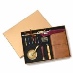 قلم الريشة ريترو ستاند لتثبيت القلم عند الانتهاء من الكتابة علبة حبر كبيرة رأس ريشة اضافي 4 علب صغيرة للحبر تناسب القلم ختم بنقش زخرفي شمعة مغلفة للتذويب دفتر للكتابة