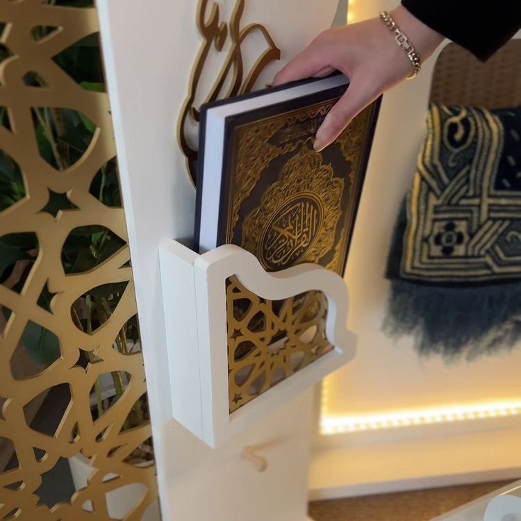 رتّب القطع الأربع لتشكيل زاوية صلاة متكاملة حسب المساحة المتوفرة. ضع المصحف على الحامل المخصص له. استخدم الحامل الجانبي لتعليق أو ترتيب سجادة الصلاة. شغّل الإضاءة في القطعة المضيئة عبر زر التشغيل للاستمتاع بأجواء روحانية هادئة. استخدم الركن يوميًا للصلاة، الذكر، أو التلاوة خلال شهر رمضان.