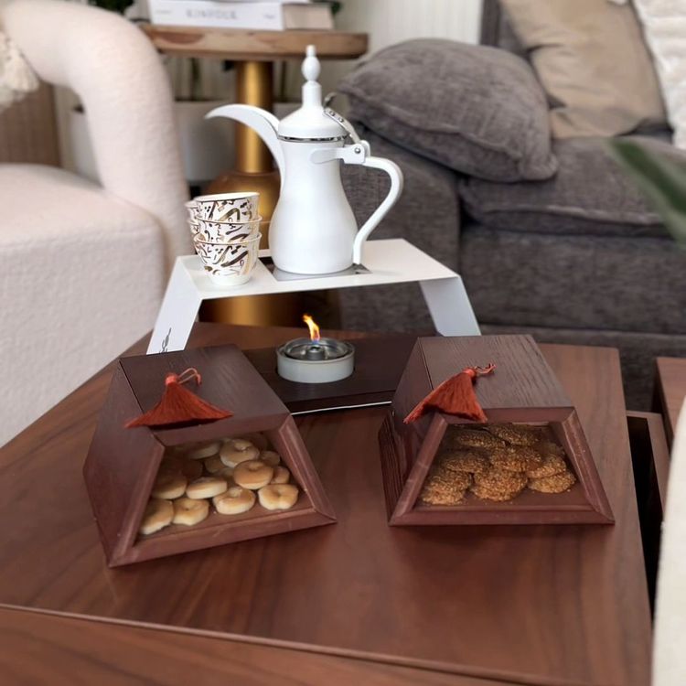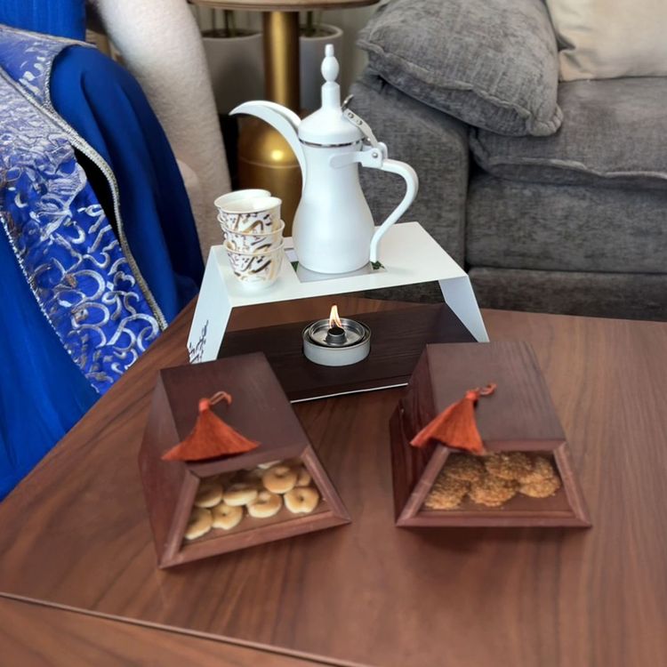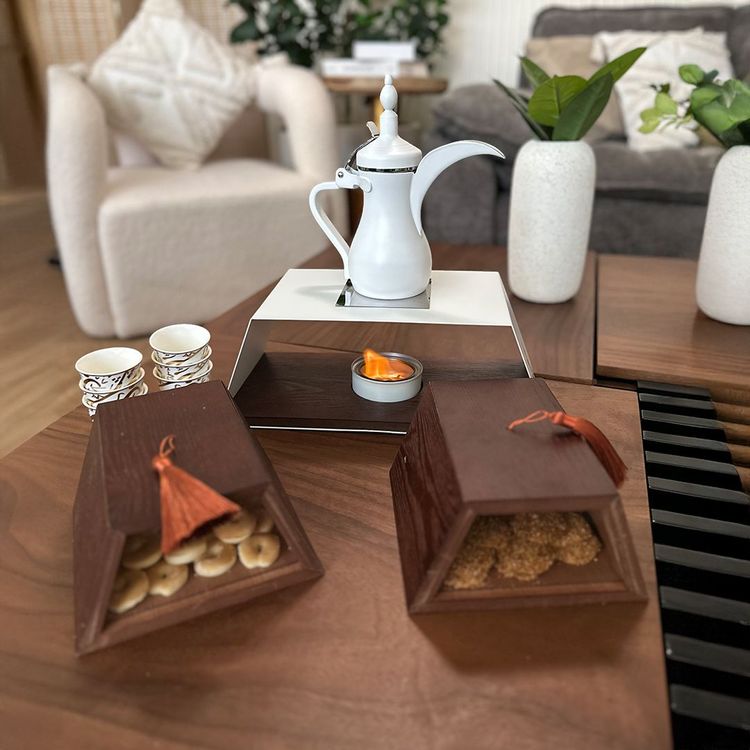 كل عنصر في هذا الطقم وُضع بعناية ليكمل الآخر، بدءًا من ستاند القهوة المصمم ليحمل الدلة بهيبة، مرورًا بصناديق الحلويات الأنيقة، وصولًا إلى وحدة التسخين ومصدر الحرارة المتنقل، ليكون كل شيء في متناول اليد دون ازدحام أو فوضى.