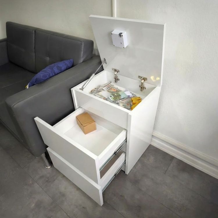 تحتوي الكومودينة على درج أمان مخفي بالكامل لا يمكن فتحه بالطريقة التقليدية، ما يوفّر مستوى عاليًا من الخصوصية والحماية للأغراض الثمينة مثل المال، المجوهرات، الوثائق المهمة، أو الأغراض الشخصية.