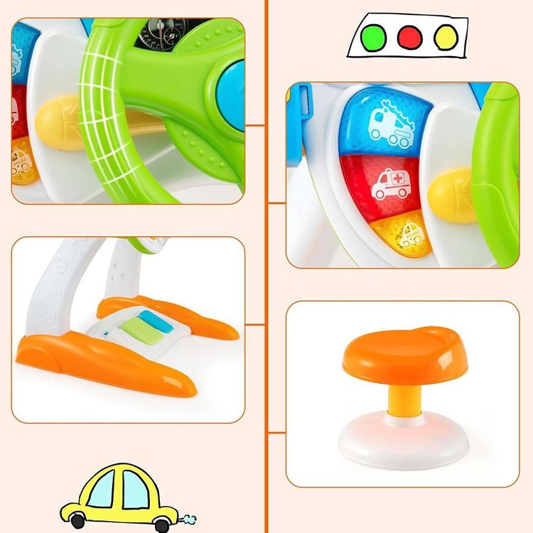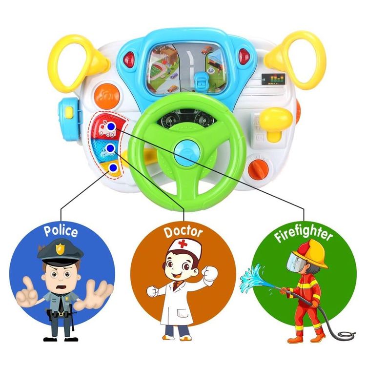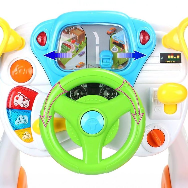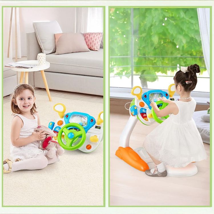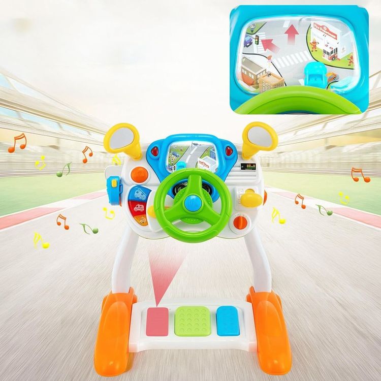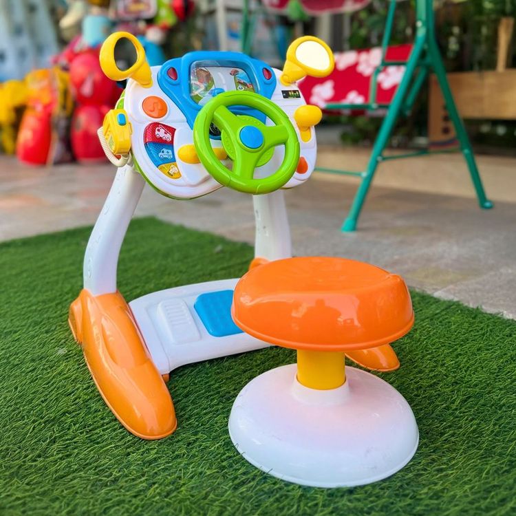 لعبة قيادة للأطفال بتصميم عصري ومرح يحاكي شكل لوحة قيادة حقيقية، مع مقود تفاعلي، أزرار ملونة، مؤثرات صوتية وضوئية تشجع الطفل على اللعب التخيلي والانغماس في عالم القيادة.