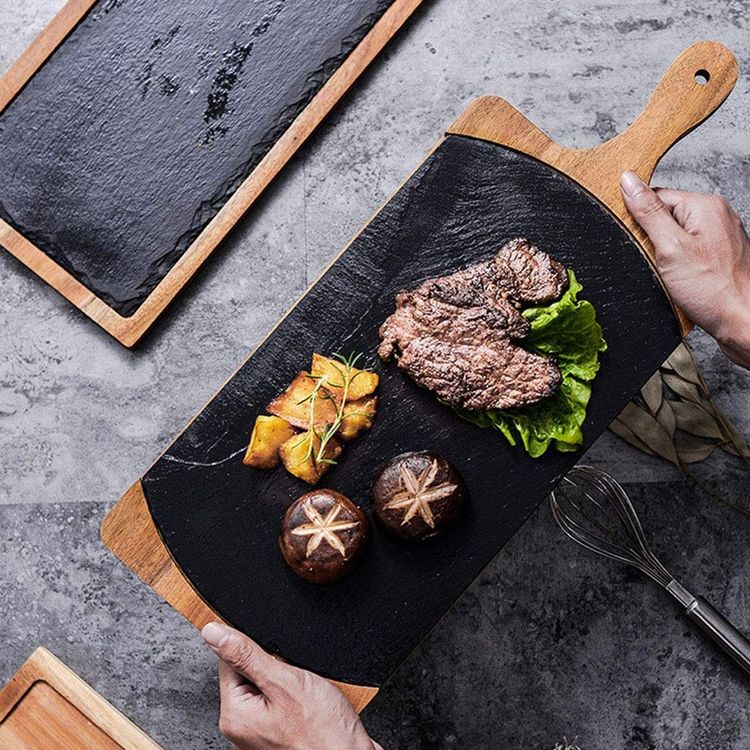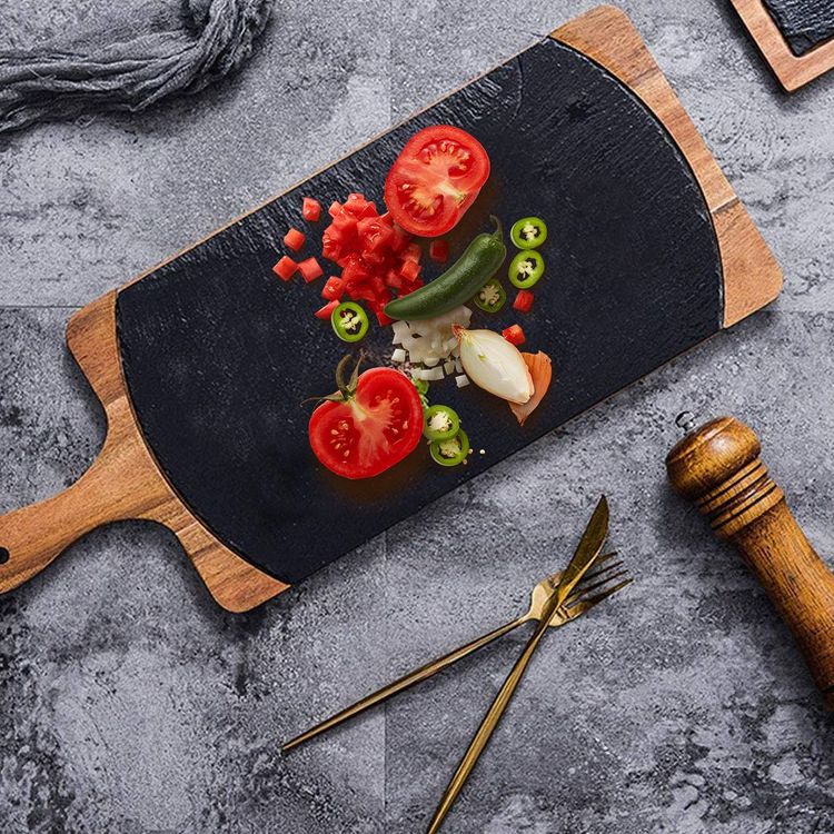 لوح تقديم خشبي بحجر الأردواز مصمم بطريقة مستطيلة مع مقبض خشبي ليعطي شكل لوح التقطيع