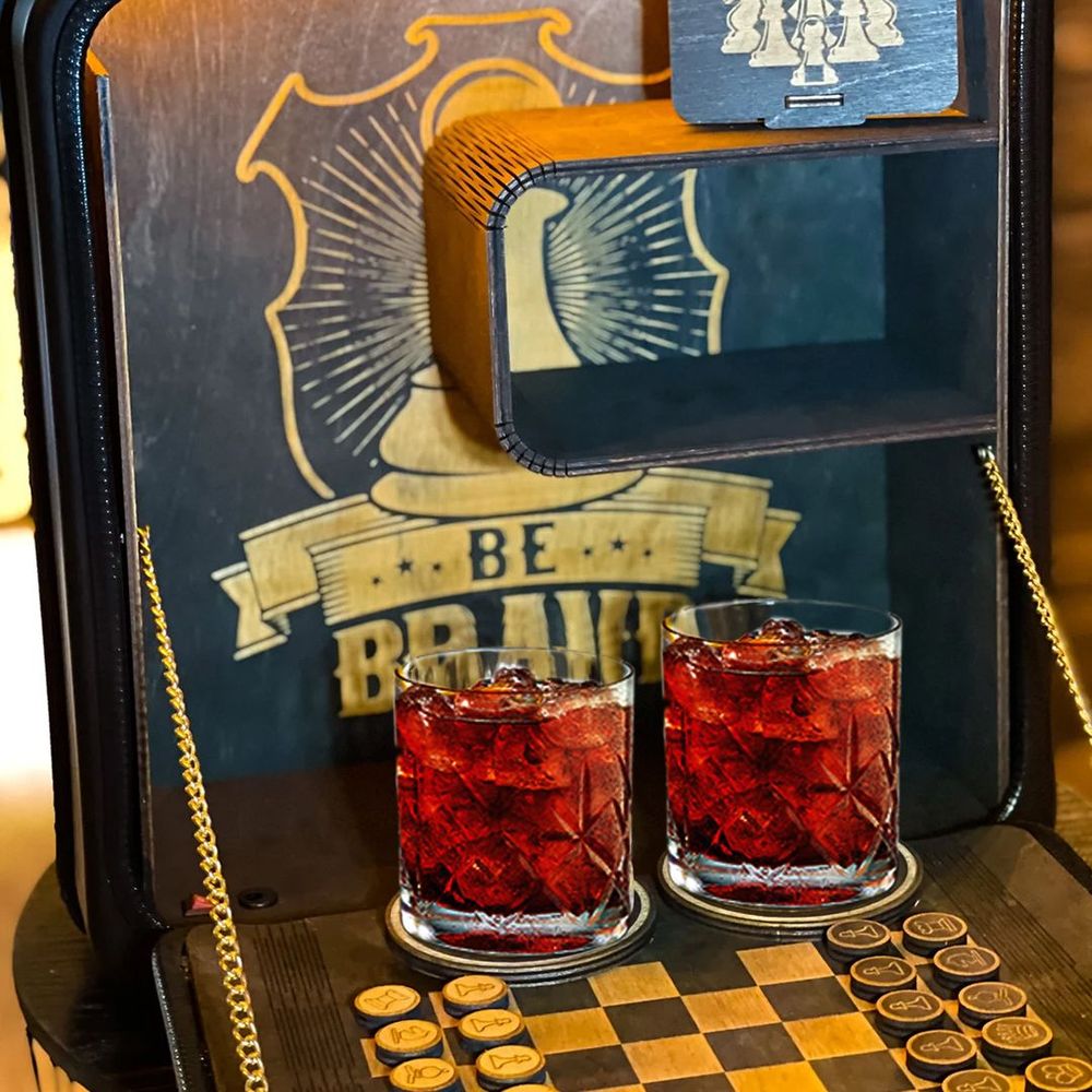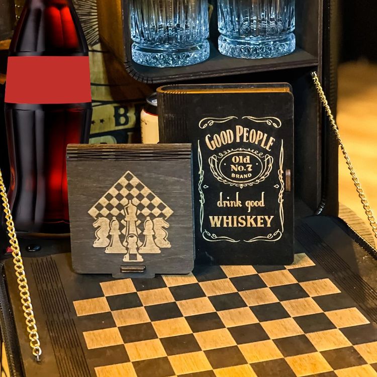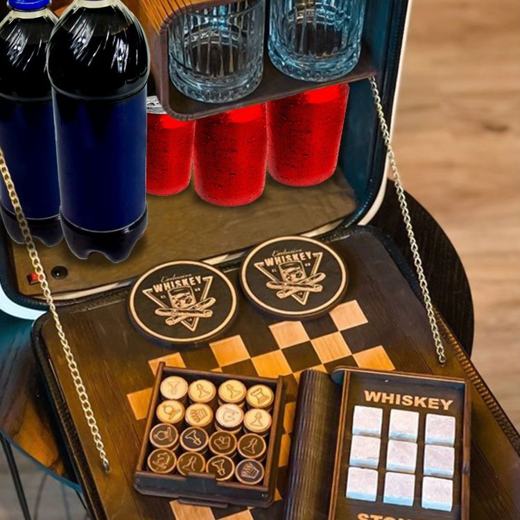 يحتوي على مكان لوضع زجاجة العصير و الكؤوس و لوح يمكن عليه لعب الشطرنج