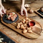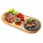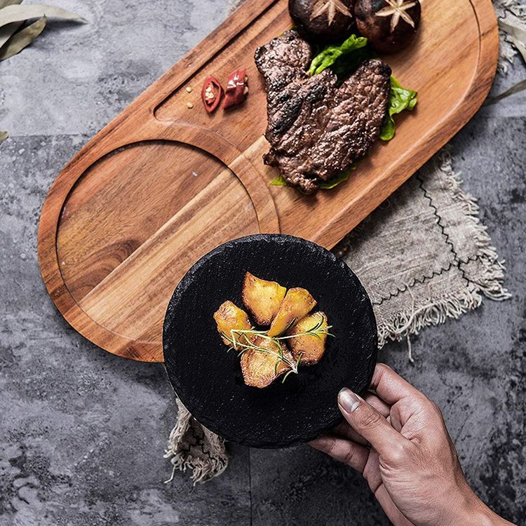 يعمل الحجر على الحفاظ على الطعام ساخن لأطول فترة ممكنة، كما يضيف لمسة فريدة بلونه الأسود لشكل اللوح الخشبي